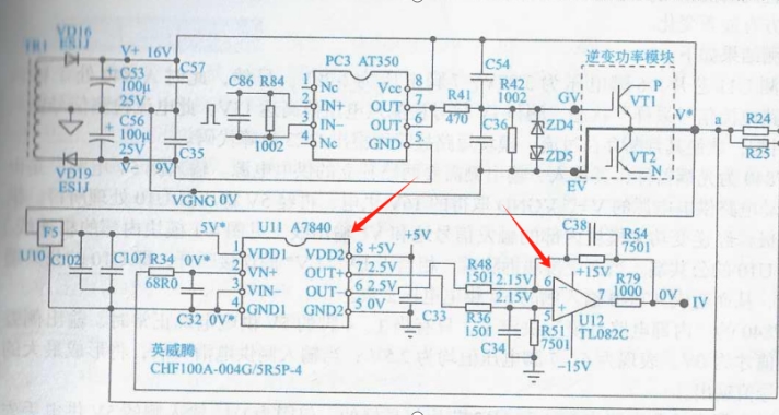 一臺被雷擊過的變頻器 ,功率模塊已經炸裂損壞 。拆掉壞模塊后 單獨用500V DC 為開關電源上電 面板顯示ITE (意為電流檢測故障),隨后顯示OC3 (恒速中過流),故障報警現象判斷 可能雷擊導致電流檢測電路損壞 上電后檢測到異常的電流報警信號 給出過電流報警